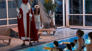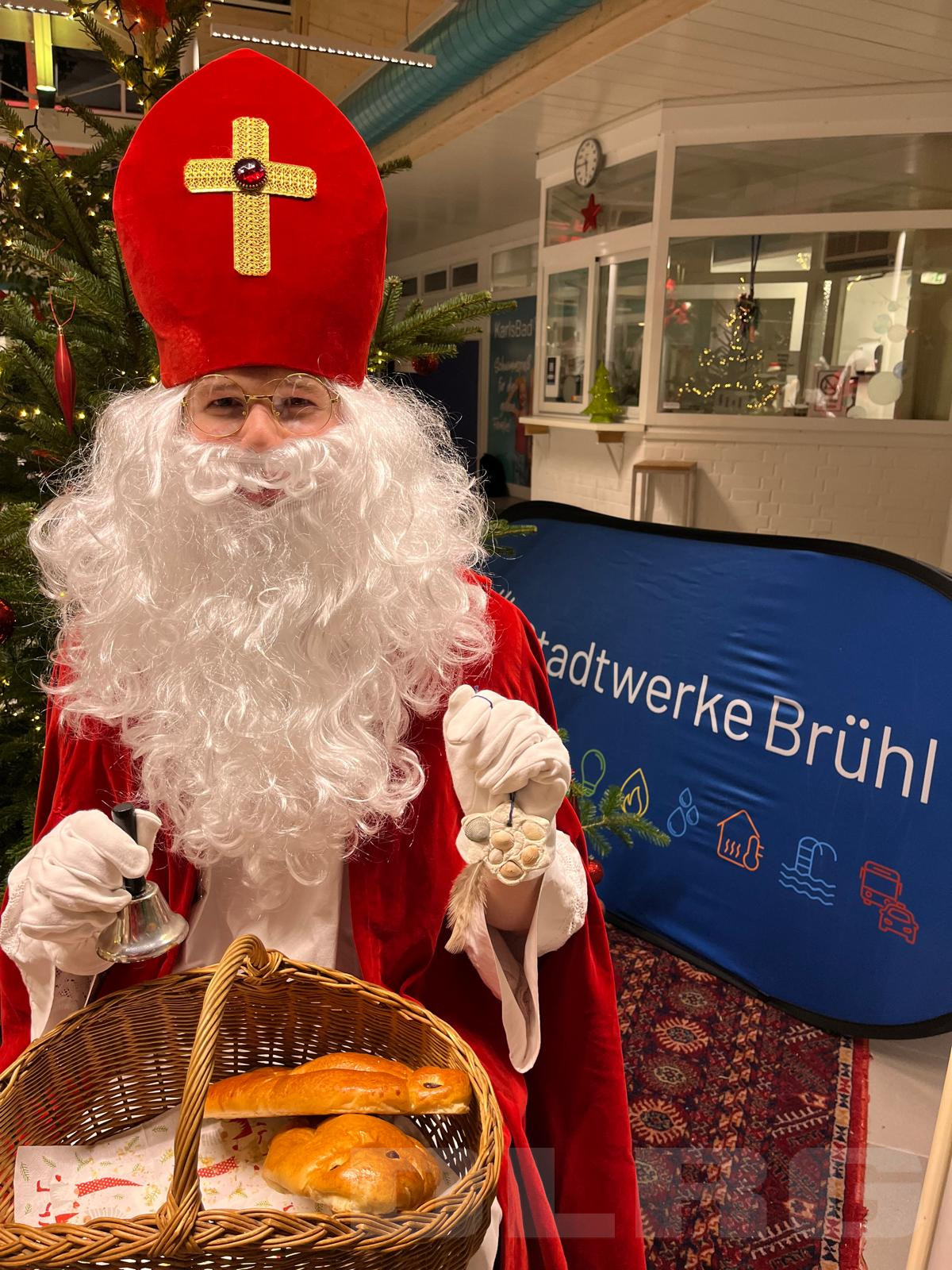 Nach den schwimmerischen Aktionen durfte natürlich auch eine kleine Stärkung nicht fehlen. Im Foyer des Karlsbades wartete der Nikolaus mit seinem himmlichschen Begleiter, um jedem Kinden zum Abschluss einen Weckmann zu überreichen. Zur großen Freude des hohen Besuchs sangen einige Kinder zum Dank ein Lied, trugen ein Gedicht vor oder überreichten selbstgebastelte Geschenke.
